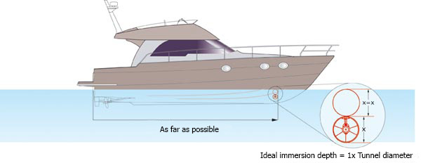 Positioning thrusters is often as important as choosing the right thrust output when seeking maximum manoeuvring performance for your boat. Thruster turbines need to be placed one full propeller diameter under the water line to achieve optimum thrust. The thruster must also be positioned as far forward in the bow or as far back in the stern as possible. A thruster stepped back from the bow (or stern) would need to be more powerful than one mounted further forward (or back), to achieve the same turning effect on the boat.
